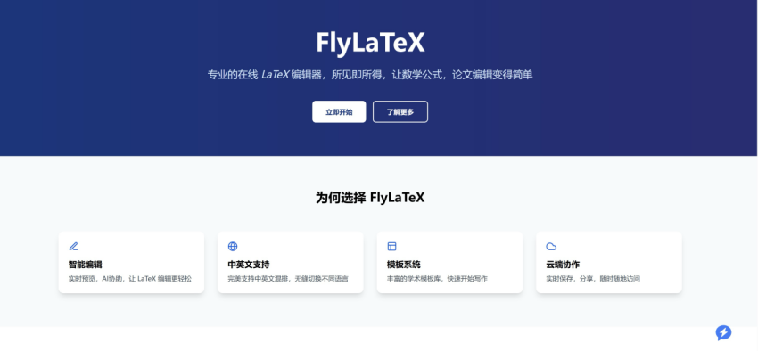 FlyLaTeX是一款功能强大的在线LaTeX编辑器,只需打开浏览器即可开始高效学术写作。无论是处理复杂的数学公式、撰写跨语言论文,还是云端协作或者寻找标准化模板,FlyLaTeX都能提供高效、便捷的解决方案。