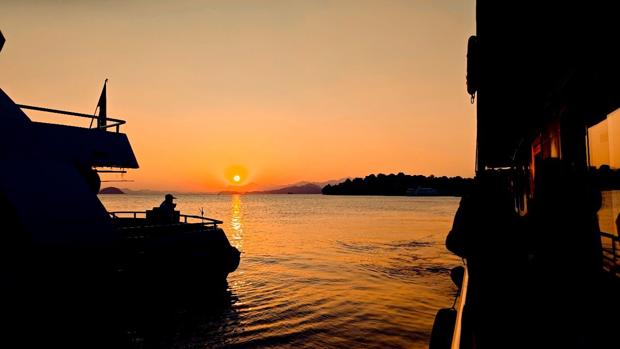 作品《暮光船语》的画面以夕阳为视觉中心,暖色调的余晖铺满天空与湖面,营造出温馨又静谧的氛围。船只与人物的剪影,增添了画面的层次感与故事感,仿佛在诉说着人与自然和谐共处的悠然。水面波光粼粼,与远处朦胧的岛屿、山峦相呼应,空间感十足。整体构图平衡,光影运用巧妙,成功地捕捉到了黄昏时分独有的浪漫与诗意,使人们可以深切地感受到大自然的美好与宁静。