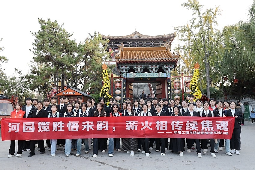 11月9日,在营销与旅游管理系主任宋亚培的指导下,任课教师牛风姣、辅导员翟亚丽带领旅游管理专业学生赴清明上河园开展了一场沉浸式导游模拟实训活动。