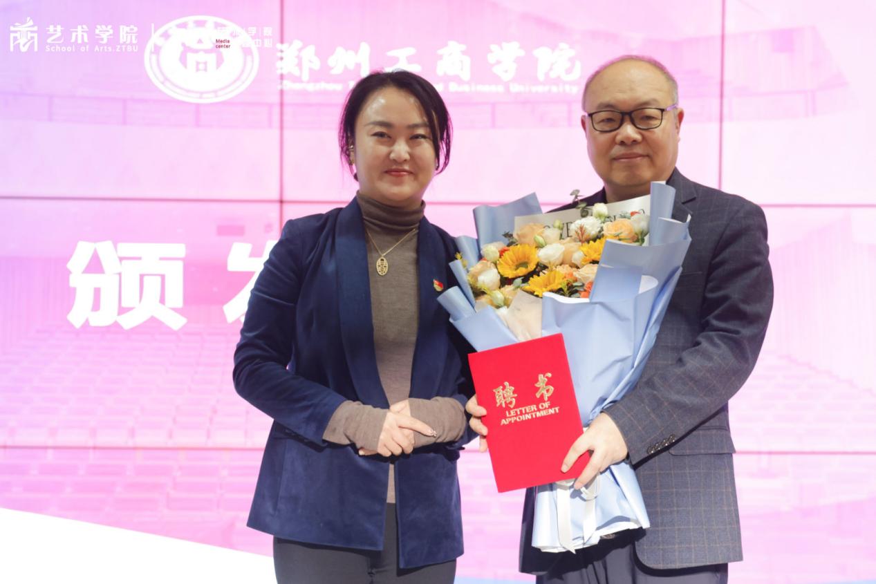 讲座伊始,艺术学院举行了客座教授聘任仪式。王覃秋为张阿利教授颁发聘书。。