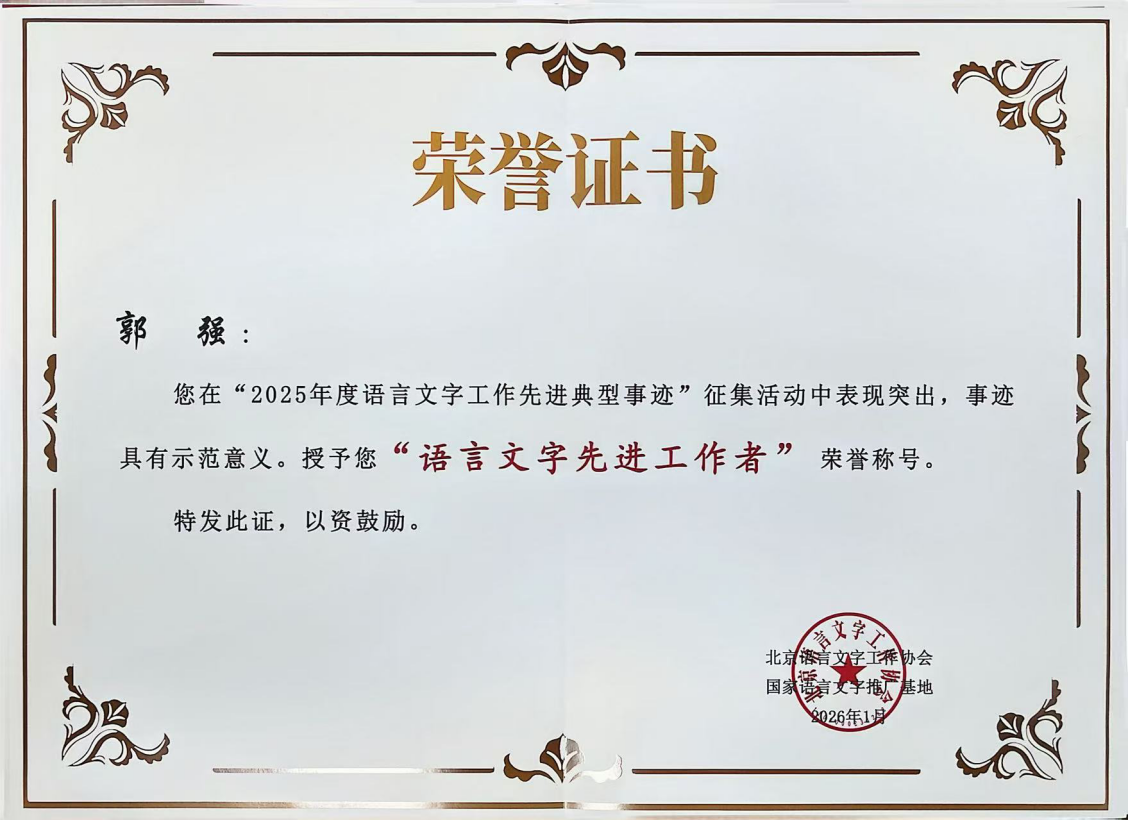 近日,从国家语言文字推广基地(北京语言文字工作协会)传来喜讯,我校艺术学院青年教师郭强凭借在“推普助力 乡村振兴 —— 郑州工商学院语言赋能实践活动”中的突出贡献,被授予“语言文字先进工作者”荣誉称号,同时获评2025年度优秀志愿者。此次表彰,不仅是对郭强老师个人深耕语言文字事业的高度认可,更是对我校长期践行语言文字推广、助力乡村振兴工作的充分肯定。